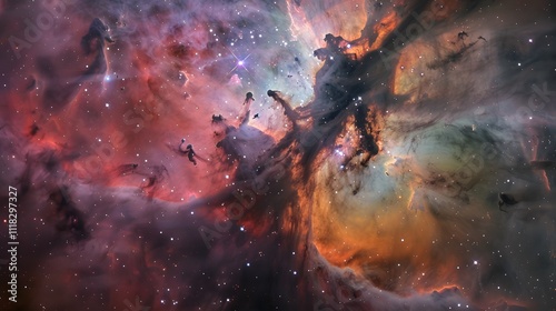 Wall mural vibrant cosmic nebula with multicolor gas clouds, swirling mix of reds, oranges, and greens in a vib
