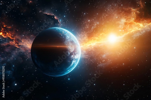 Wall mural vibrant cosmic scene depicting a planet in space, illuminated by a distant sun, surrounded by colorf