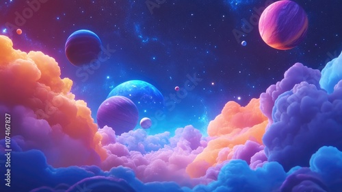 The watermark will not be included on Wall mural.: Vibrant deep space banner background featuring various stars planets and cloud formations illustrati