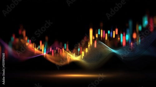 The watermark will not be included on Wall mural.: Vibrant digital abstract representing data trends with colorful waves and lights on a dark backgroun