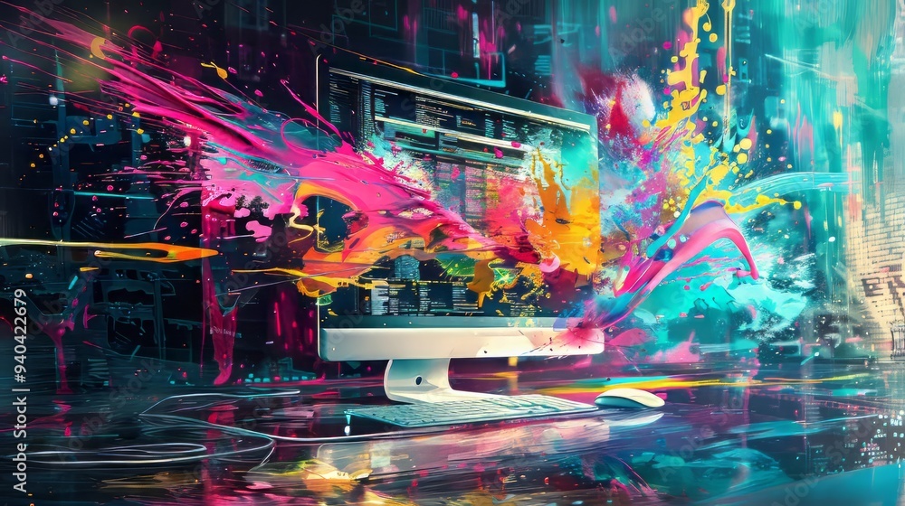 Wall mural : Vibrant digital art background featuring a computer screen with dynamic paint splashes and futuristi