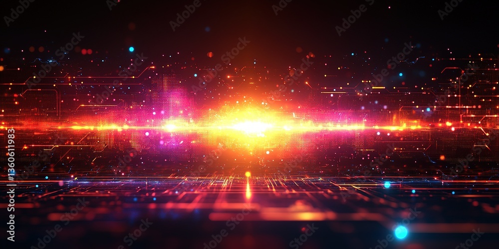 Wall mural : Vibrant digital background of abstract light patterns with glowing elements and lines on a dark back