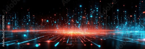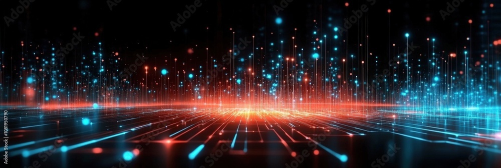 Wall mural : Vibrant digital landscape with glowing particles and lines representing data flow and connectivity i