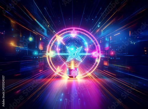 Wall mural : Vibrant double exposure of a glowing circular abstract design with radiating beams and geometric sha