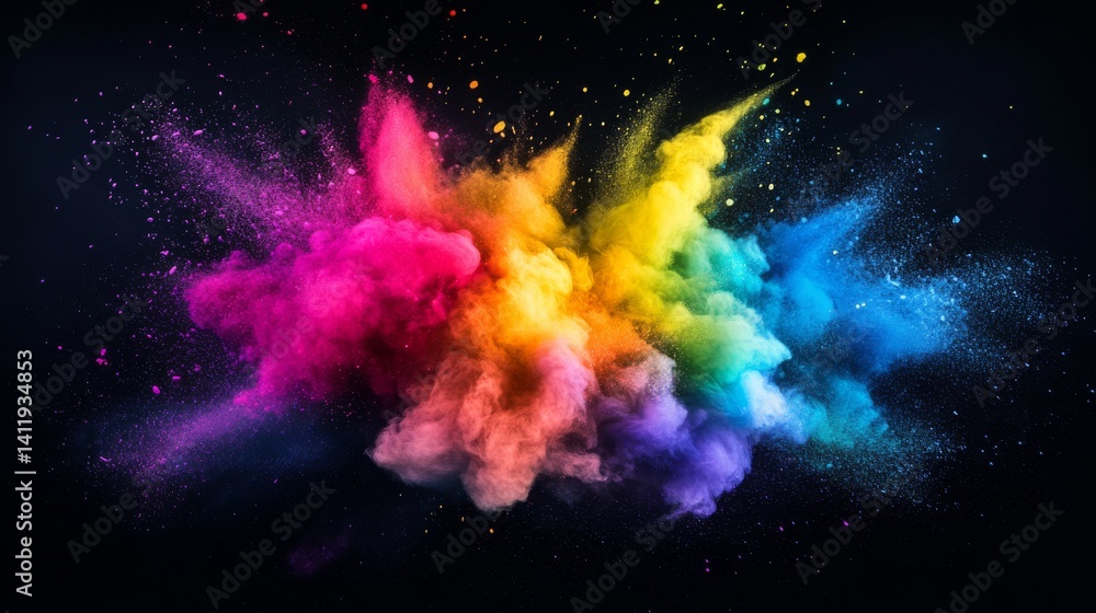 The watermark will not be included on Wall mural.: Vibrant explosion of rainbow colors bursting in a dynamic splash pattern featuring bold paint splash