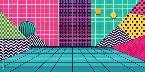 The watermark will not be included on Wall mural.: Vibrant geometric composition featuring interlocking patterns and 3d shapes on a retro-inspired grid