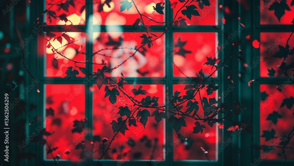 The watermark will not be included on Wall mural.: Vibrant ivy branches frame a red-tinted window in an atmospheric indoor setting during twilight
