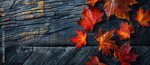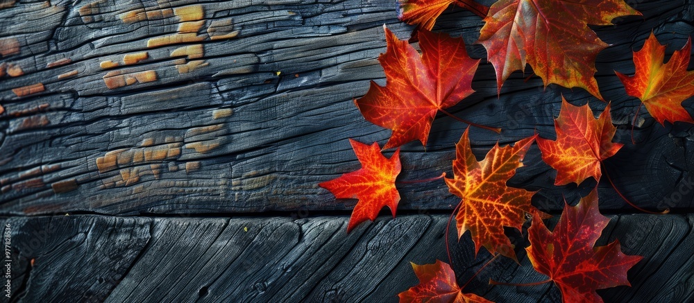 The watermark will not be included on Wall mural.: Vibrant maple leaves on the rustic wooden table - copy space image - place for adding text and design
