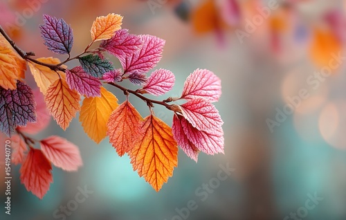 The watermark will not be included on Wall mural.: Vibrant multicolored autumn leaves on a branch with soft bokeh background in pastel tones generative