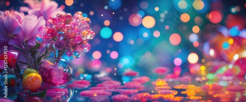 Wall mural : Vibrant multicolored bokeh background with floral elements and sparkling decorations creating a drea