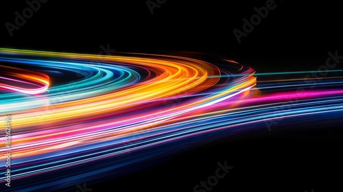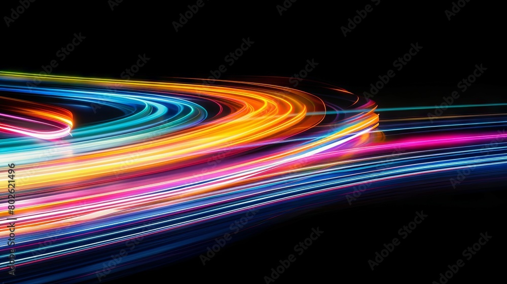 Wall mural : Vibrant multicolored light streaks on black backdrop - electrifying streams of neon lights bending t
