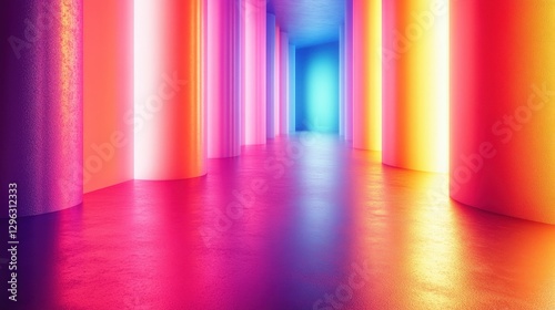 The watermark will not be included on Wall mural.: Vibrant neon light corridor with colorful columns creating a futuristic and immersive atmosphere