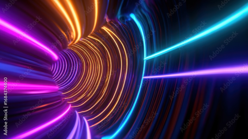 The watermark will not be included on Wall mural.: Vibrant neon light tunnel with swirling colors creating a dynamic visual experience in a futuristic