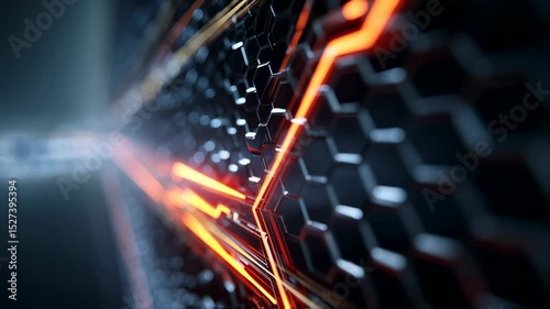 The watermark will not be included on Wall mural.: Vibrant orange light trails flowing dynamically across dark hexagonal surface, generating futuristic