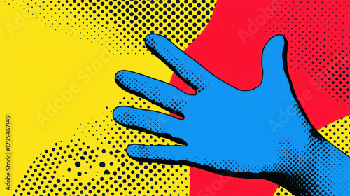The watermark will not be included on Wall mural.: Vibrant pop art background featuring blue hand against red and yellow backdrop, creating playful and