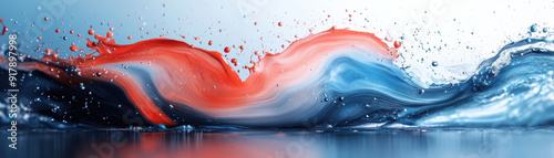 The watermark will not be included on Wall mural.: Vibrant red and blue paint splashing and swirling in water, creating a dynamic and mesmerizing abstr