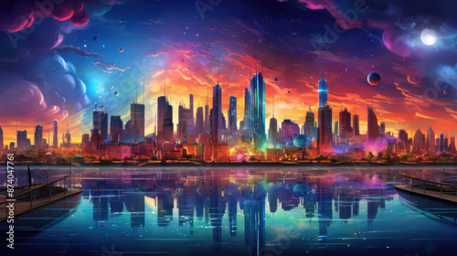 The watermark will not be included on Wall mural.: Vibrant skylines in the future - , generative ai