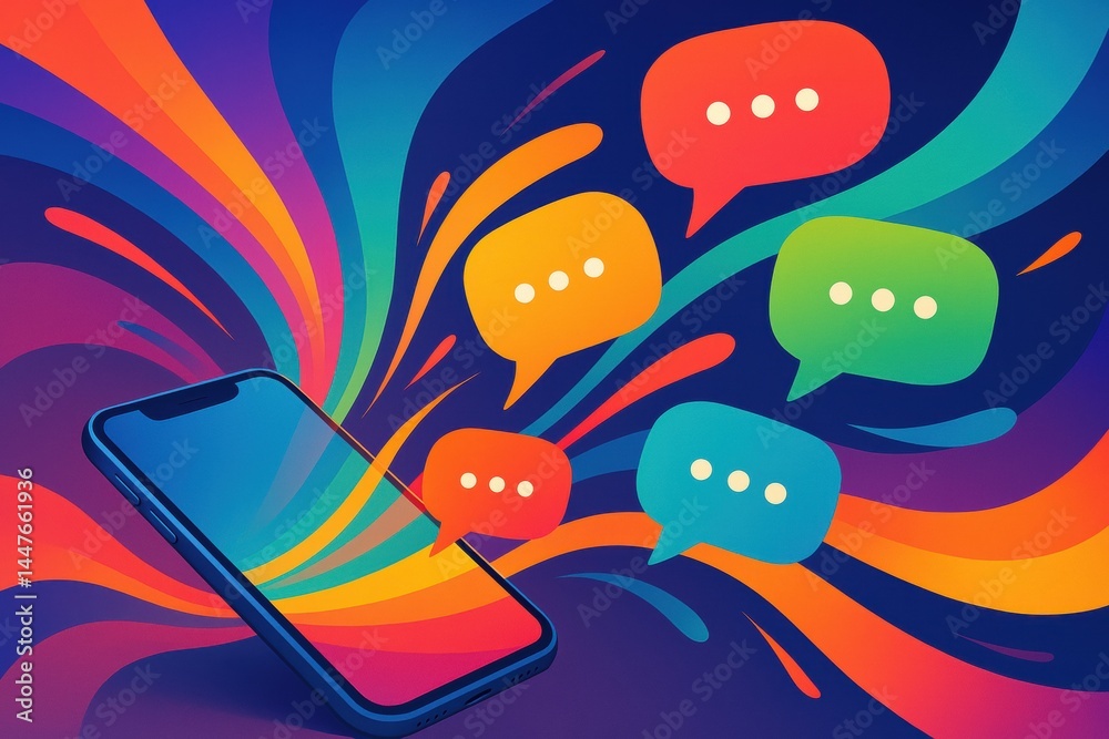Wall mural : Vibrant smartphone graphic with colorful chat bubbles and dynamic swirls representing communication