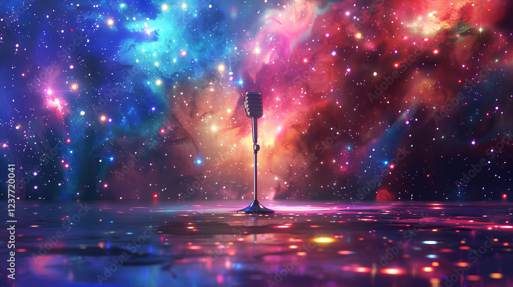 Wall mural vibrant stage with an empty microphone, surrounded by mesmerizing lights and colorful rays of light