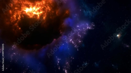 Wall mural : Vibrant supernova explosion with plasma plumes in deep outer space showing expansion and cosmic dest