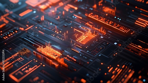 The watermark will not be included on Wall mural.: Vibrant techno circuit board with glowing microchips and data flows