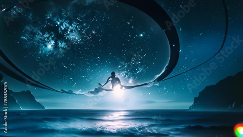 Wall mural video animation of surreal blend of oceanic and cosmic elements. a surfer is poised on a wave that s