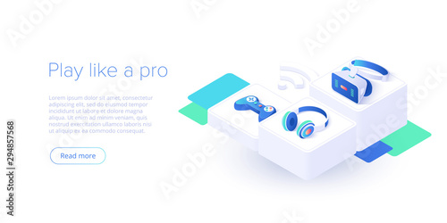 The watermark will not be included on Wall mural.: Video game controller and headphones set in isometric vector illustration - videogame console joystic