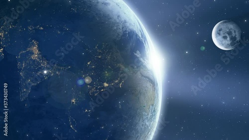 Wall mural : Video of universe flyby - camera moves towards earth planet and moon seen at a distance while stars f