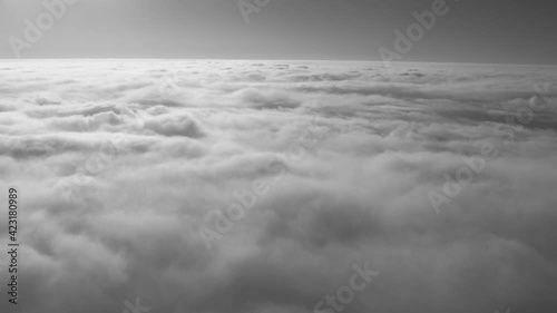 The watermark will not be included on Wall mural.: View from flying high in heaven airplane - sunny peaceful fluffy white clouds and blue sky with horiz