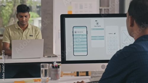 The watermark will not be included on Wall mural.: View from the back of male ux designer working with mobile app wireframes on computer at desk in ope