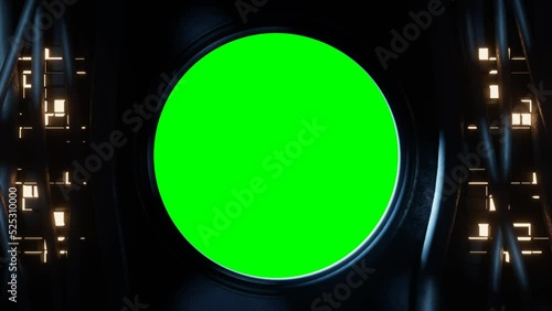 Wall mural : View of a round window with green screen background seen from inside a spaceship or sci-fi environme