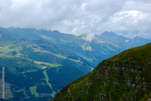View of an amazing mountain landscape on a hazy day with gray clouds and fog over the peaks in autumWall mural