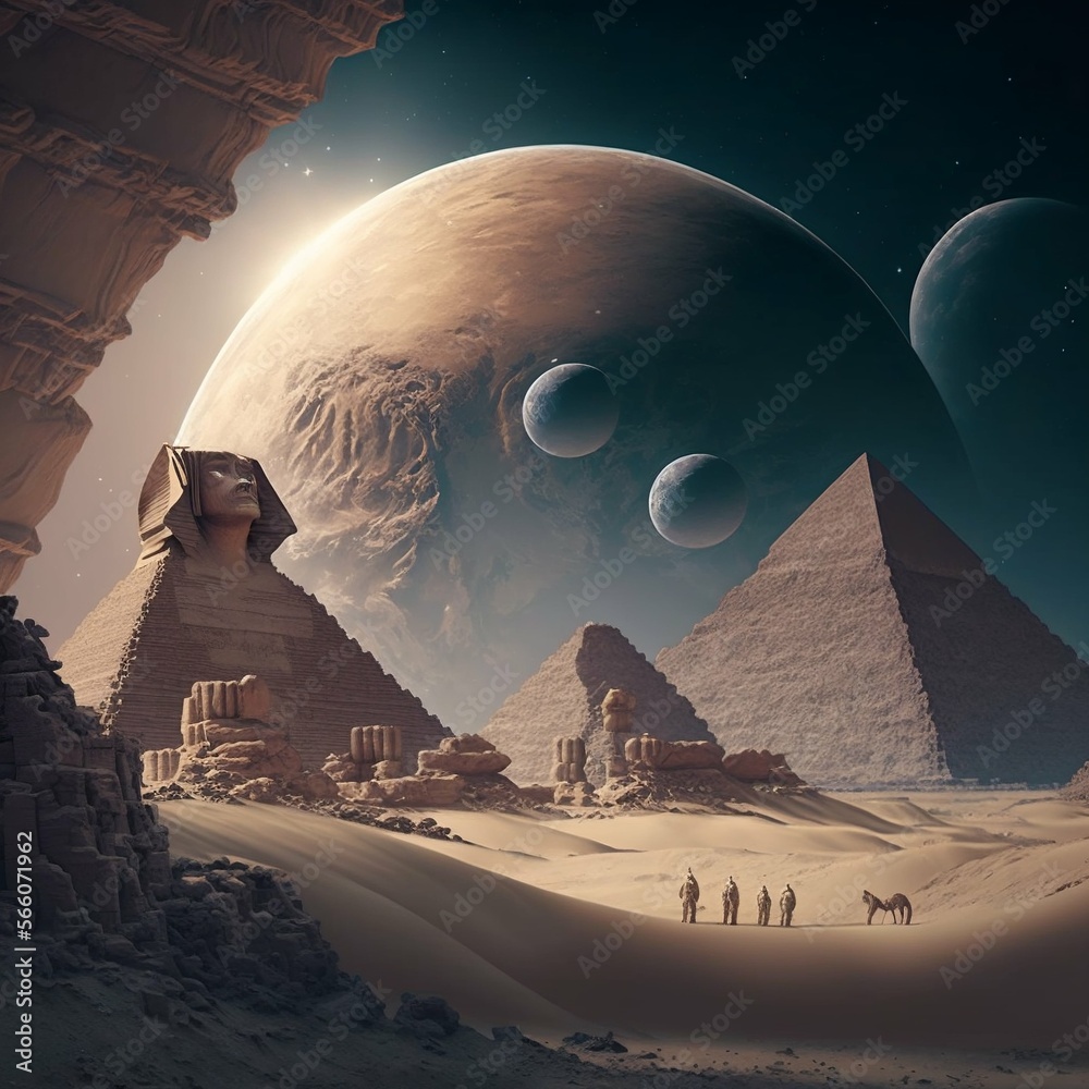 The watermark will not be included on Wall mural.: View of ancient pyramids at night, under a starry sky - generative ai