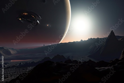 Wall mural : View of distant planet, with spacecraft in the foreground, created with generative ai
