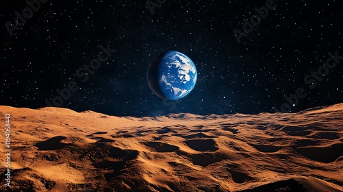 Wall mural view of earth from a rocky planet surface with a starry sky background in space - Wall murals Wall mural view of earth from a rocky planet surface with a starry sky background in space - Wall murals