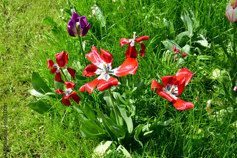 Wall mural view of fading open tulip flowers in natural conditions in the garden. completion of flowering. natu - Wall murals Wall mural view of fading open tulip flowers in natural conditions in the garden. completion of flowering. natu - Wall murals