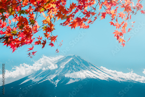 Wall mural view of kawaguchiko lake with maple leaves in front of fuji-san mountain famous place of japan for t - Wall murals Wall mural view of kawaguchiko lake with maple leaves in front of fuji-san mountain famous place of japan for t - Wall murals