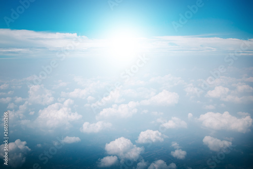 Wall mural : View of the sky clouds above the clouds from airplane window with sun light retro color filter