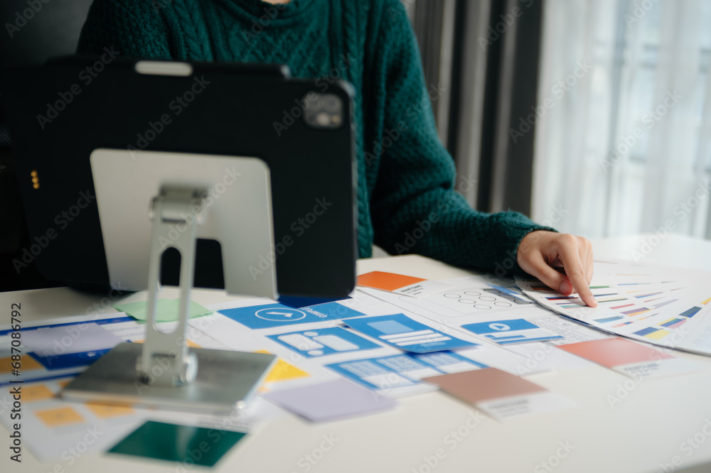 Wall mural : View of ui developer team brainstorming on their project with laptop, smartphone and digital tablet -