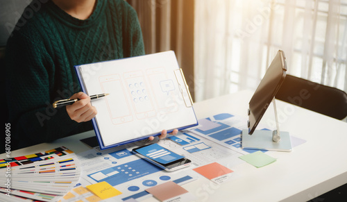 Wall mural : View of ui developer team brainstorming on their project with laptop, smartphone and digital tablet -