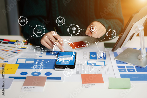 Wall mural : View of ui developer team brainstorming on their project with laptop, smartphone and digital tablet -