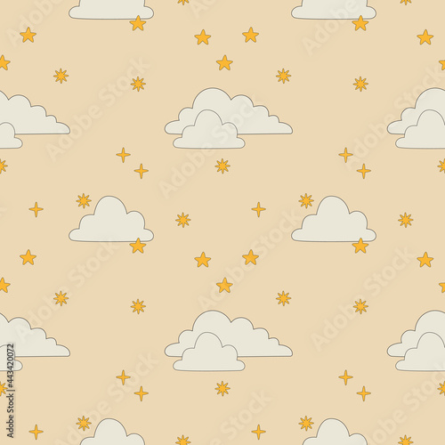 Wall mural vintage seamless pattern with stars and clouds. boho style pattern. digital retro paper with celesti - Wall murals Wall mural vintage seamless pattern with stars and clouds. boho style pattern. digital retro paper with celesti - Wall murals