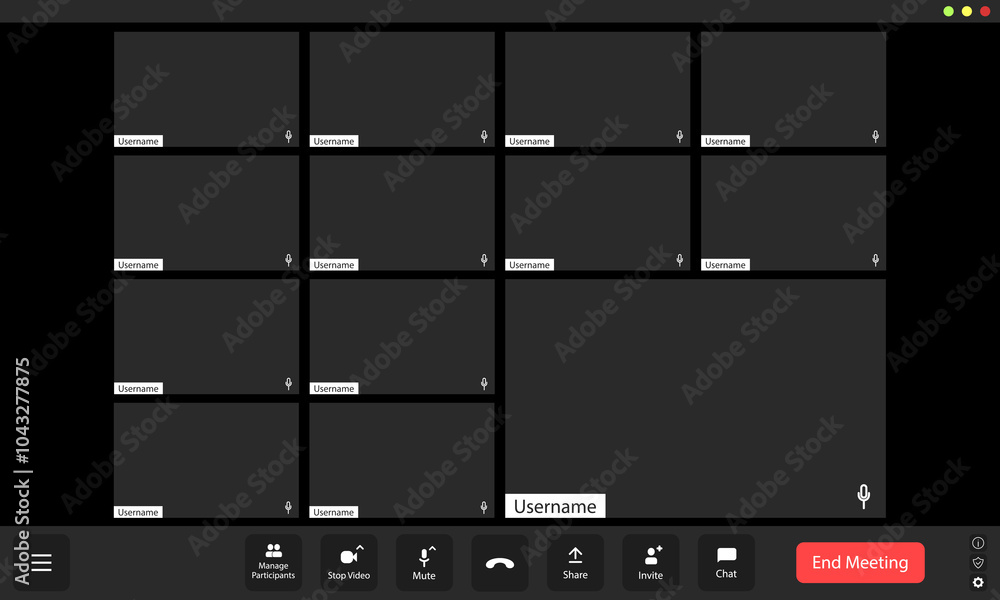 The watermark will not be included on Wall mural.: Virtual meeting platform in use with empty participant windows during a scheduled online conference
