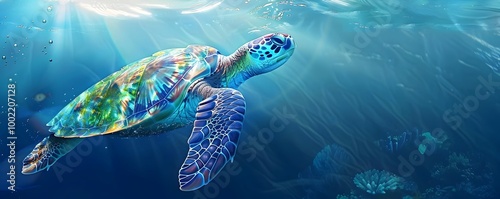 Wall mural : Virtual sea turtle explores vibrant underwater ocean world with customizable shell patterns