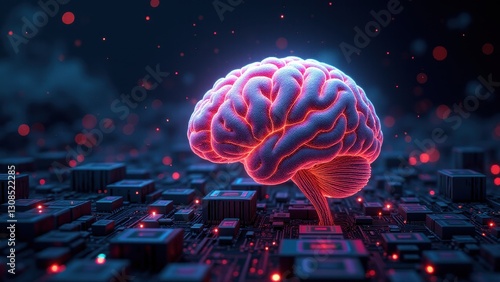 The watermark will not be included on Wall mural.: Virtual thinking systems, a glowing brain amidst circuits in digital void energy connecting neurons