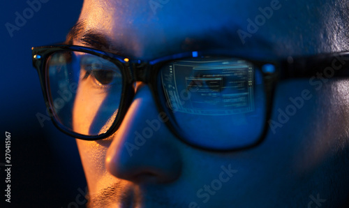 Wall mural vision, hacking and technology concept - close up of hacker eyes in glasses looking at computer scre