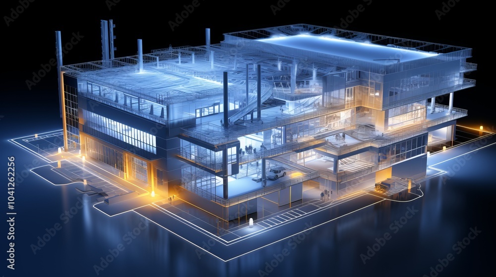 Wall mural vision of architecture of a 3d model house project with blueprint
