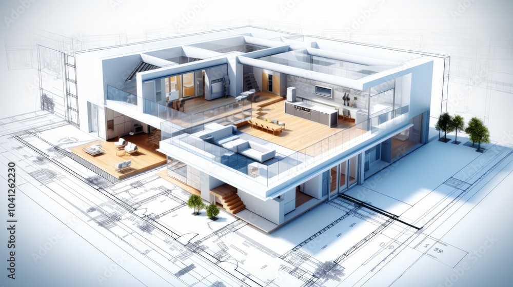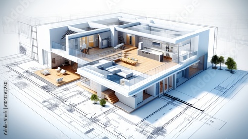 The watermark will not be included on Wall mural.: Vision of architecture of a 3d model house project with blueprint