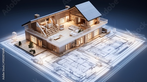 Wall mural vision of architecture of a 3d model house project with blueprint