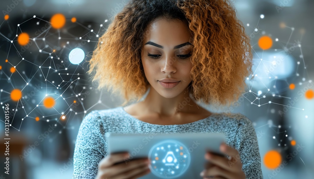 The watermark will not be included on Wall mural.: Visual representation of a serious woman using a tablet to interact with a chatbot